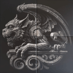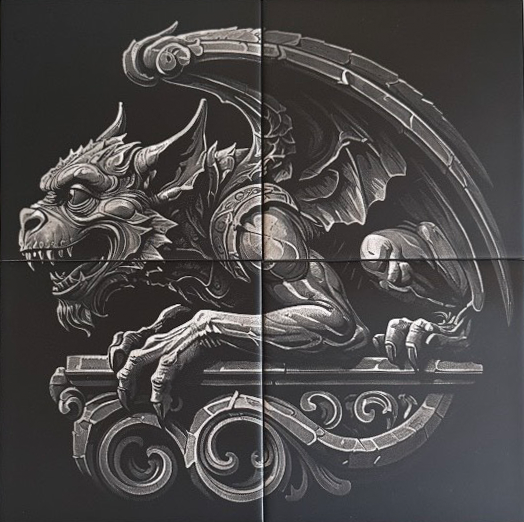 Seen from the side, the Sentinel rests across his plinth with a stillness that carries weight. The line of the back, the tension in the claws, and the turn of the head sit in a sweep of deep shadow, revealing detail only where the light permits it. This view holds a different kind of vigilance — quieter, measured, but no less present. A companion to Keeper, the Sentinel anchors the flank of the House with a watch that never softens.